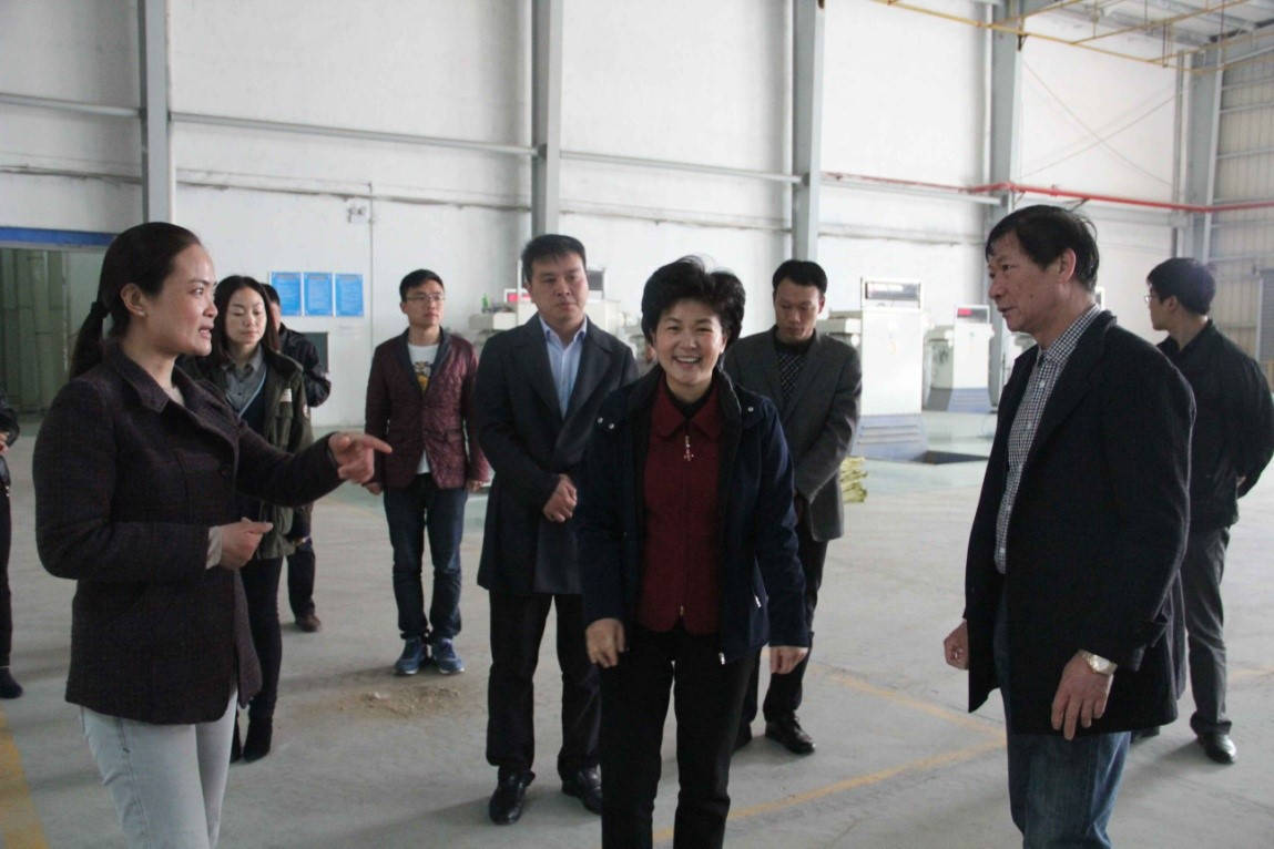 圖1.陳成發(fā)董事長(右二)陪同周文霞市長(右四)參觀工廠